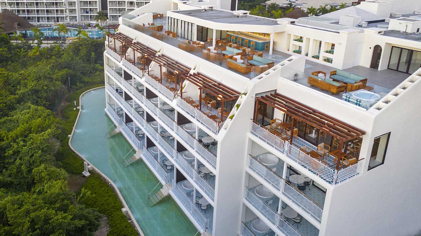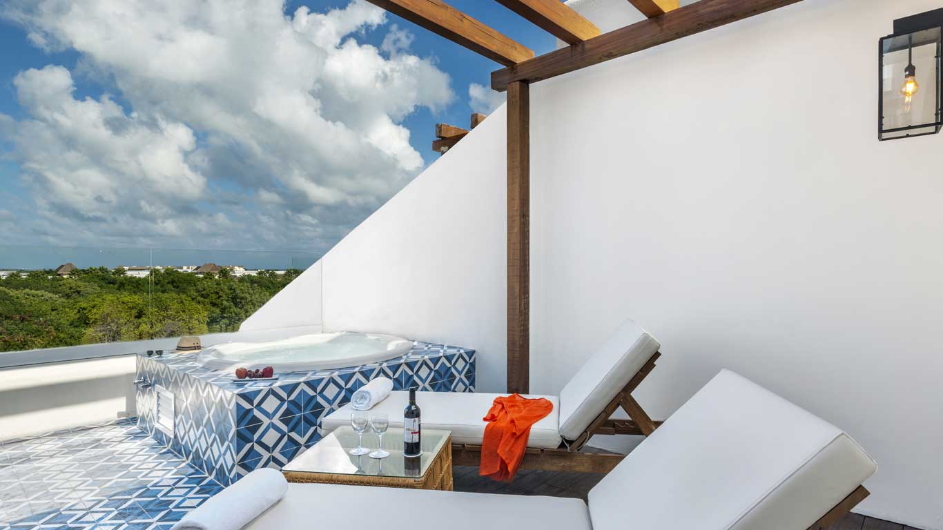 Exclusive suite with a roof top terrace that offers a stunning ocean view from the whirlpool. The bedroom and the separate lounge are complemented with the Privilege services. Maximum capacity 3 people.
